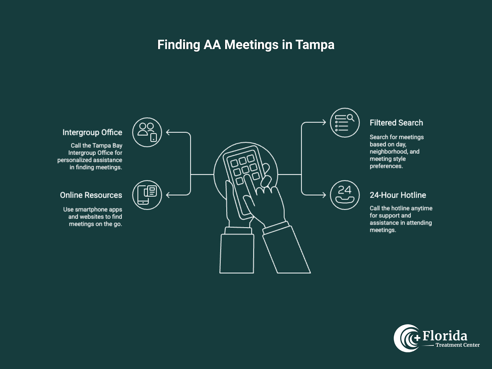 One phone call, one meeting, one decision can completely change your life's direction. You've seen what alcohol's cost you. Now imagine getting all that back: the relationships, the goals, the mornings without regret. Thousands of people in Tampa have done exactly that through AA meetings and the support system they found there. Your turn. Florida Treatment Center builds personalized plans that work with your life and include connection to AA meetings Tampa locals attend. Detox if you need it, therapy, outpatient programs, help navigating insurance. We handle the complicated stuff so you can focus on getting better. We know AA works, and we'll help you plug into that community while providing the clinical support that gives you every advantage.